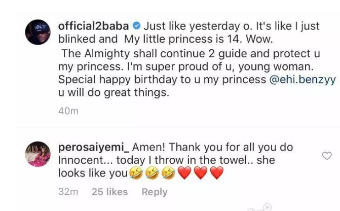 Nigerian iconic singer, Innocent Ujah Idibia, popularly known as 2Baba, and his baby mama Pero Adeniyi are celebrating their first daughter Ehi Idibia. Ehi is 2Baba’s second child and she is celebrating her 14th today, April 27th. The dotting father and Pero took to their Instagram pages to celebrate Ehi.