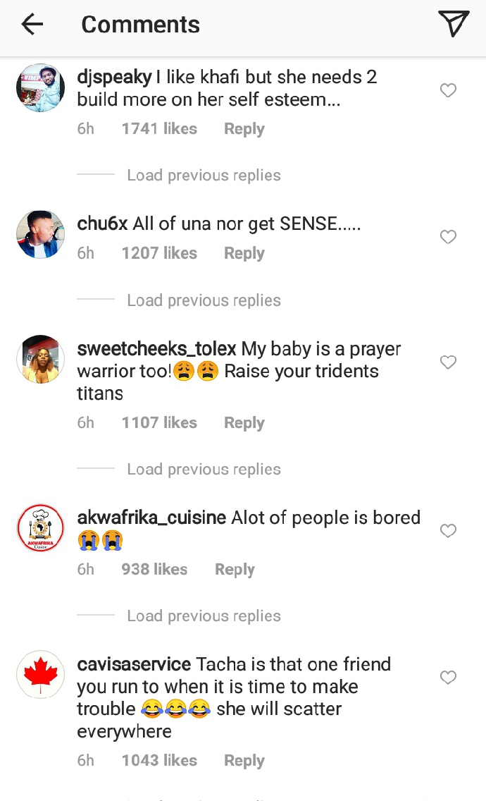 Few hours ago, khafi took to her official instagram page to have a live session with Tacha. During the live session, tacha was seen praying against khafi's haters and trolls that have refused to allow Khafi enjoy the fruits of her labour. Tacha went further praying for along period of time which made her fans react;