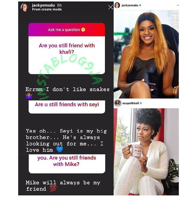 During Jackye's instagram live question and answer session with her fans yesterday April 26, 2020, a fan asked Jackye if she was still friends with Khafi and then she replied saying "I don't like snakes " meaning Khafi is a snake and she doesn't like her.