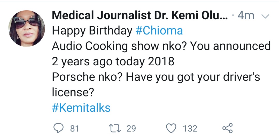 But the United States and Canadian trained Medical and Investigative Journalist, Kemi Olunloyo has mocked Chioma on her Birthday. According to the statement Kemi Olunloyo who is the daughter of once military Governor of Old Oyo State made on her official Twitter handle, she asked Chioma about her "audio cooking show".