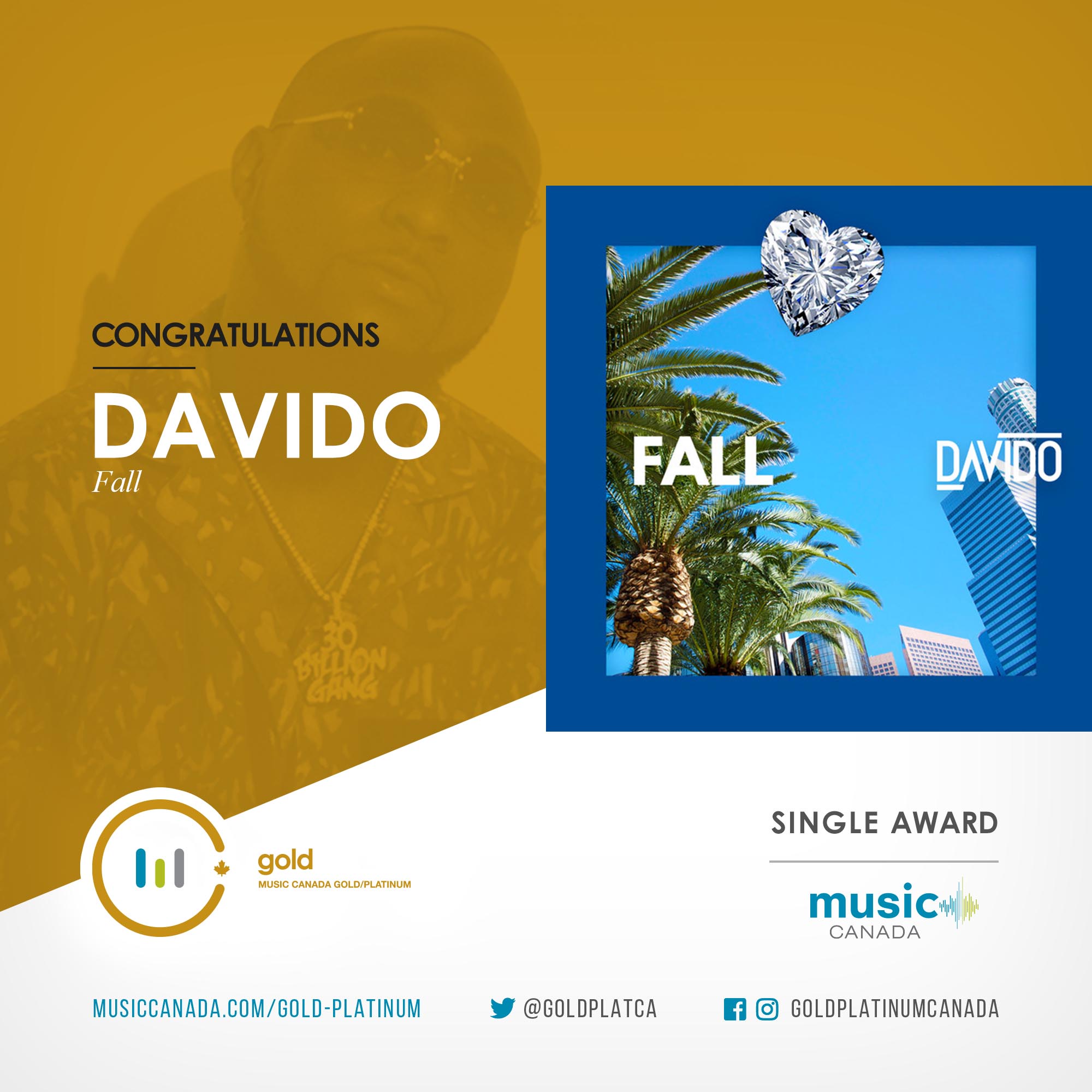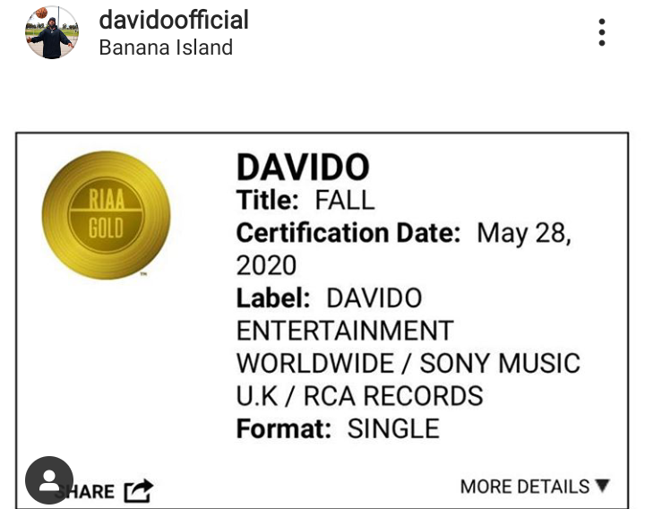 Davido’s fall is now gold in USA !!!!!!!! Few weeks ago it was gold in Canada ... What a good time for Afro beats .... Makes it the first african solo song to accomplish this.