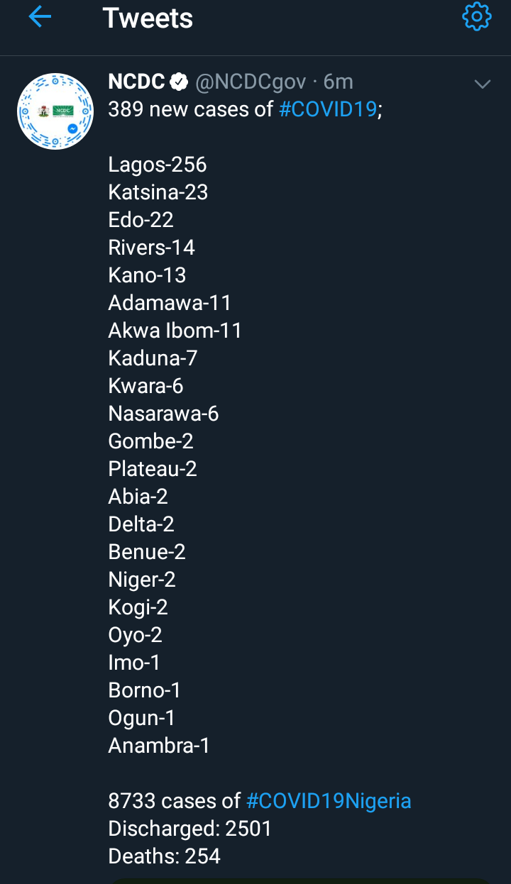 This brings it to a total of 8,733 confirmed cases in Nigeria, 254 deaths and 2,501 discharged patients.