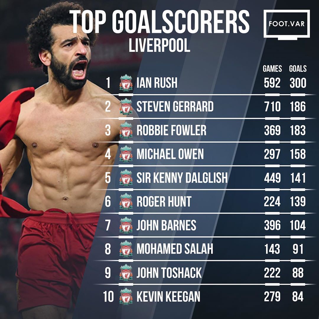 Top 10 Most Goal Scorers In Liverpool: Can Mohammed Salah Reach The Top 5 Before His Transfer.