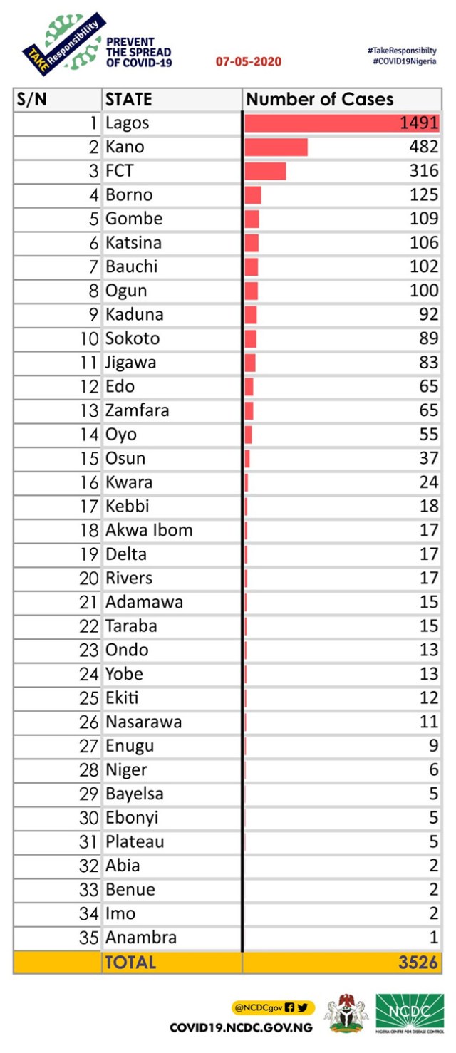 Deaths: 107 pic.twitter.com/H5ouYwO9Cj— NCDC (@NCDCgov) May 7, 2020