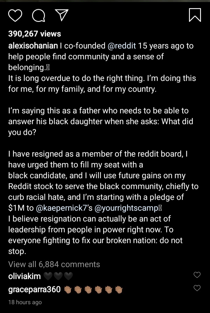 It is long overdue to do the right thing. I'm doing this for me, for my family, and for my country. I'm saying this as a father who needs to be able to answer his black daughter when she asks, 'What did you do?' I have resigned as a member of the reddit board, I have urged them to fill my seat with a black candidate."