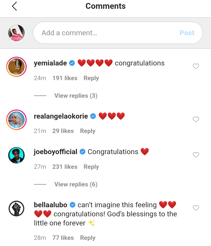 Fans and celebrities including Falz The Bahd Guy, Tekno, Yemi Alade, Patoranking and Funke Akindele have all used the same platform to pour in their congratulatory messages.