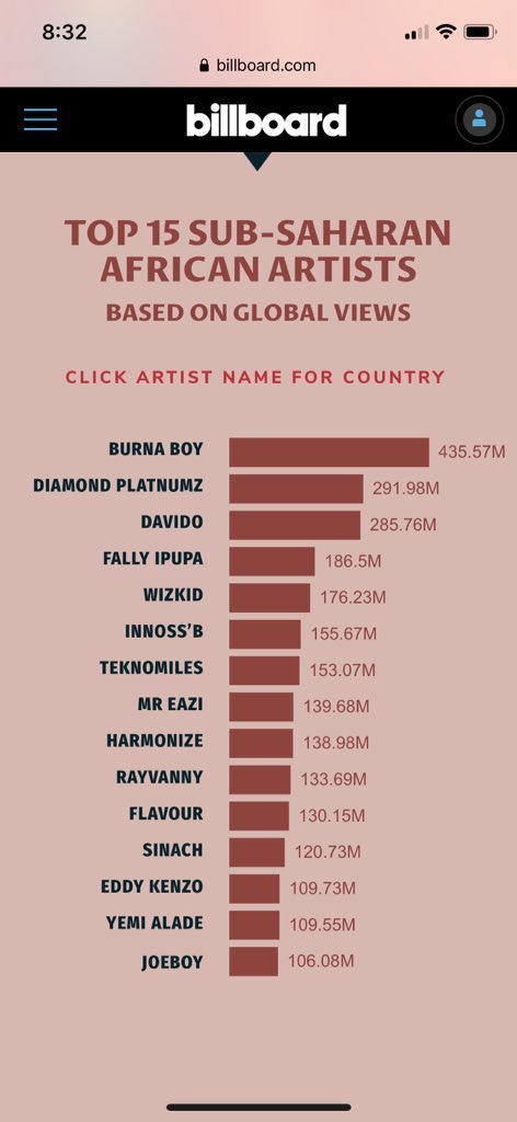 I wonder what the fate of afro pop genre would have been without Nigerian music as most of the artist in Billboard's Top 15 Sub Saharan African artists, 9 artists out of 15 are all Nigerians based on global views.