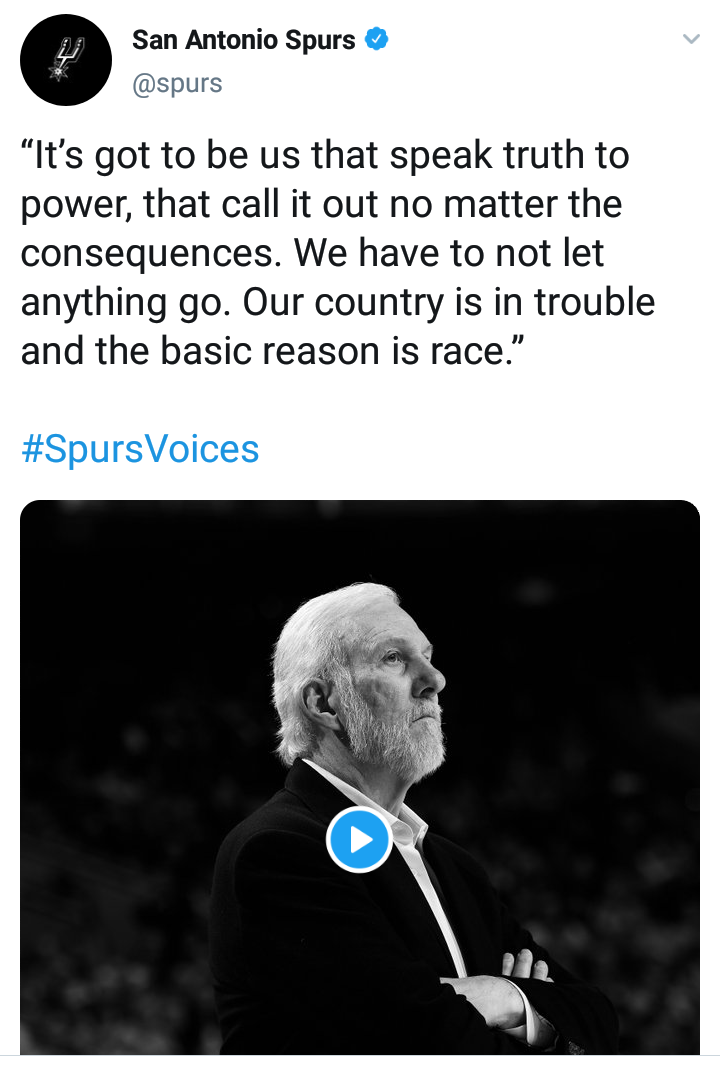 Popovich spoke with a senses of history and concern in a video that is posted on the official Twitter account of San Antonio Spurs with the inscription, "It's got to be us that speak truth to power, that call it out no matter the consequences. We have to not let anything go. Our country is in trouble and the basic reason is race."