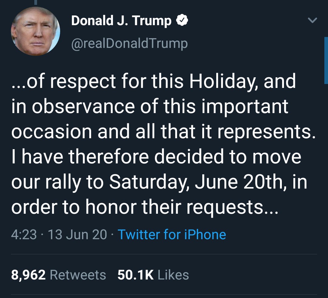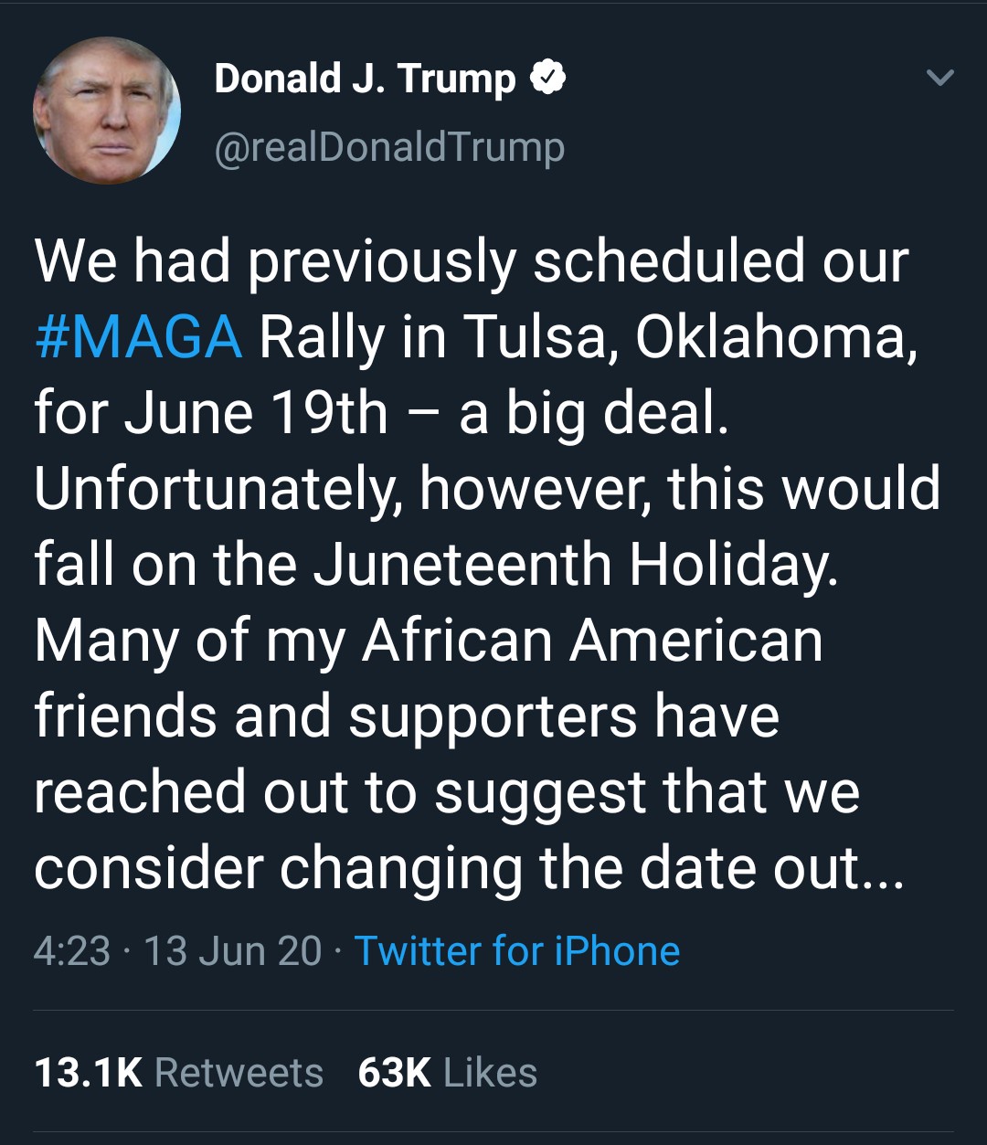 However, President Trump has come to say that scheduling the rally on the same day as the Juneteenth Holiday was one that was done with the best of intentions, but that since must people disagree with such intentions, that he has instructed to have the planned rally rescheduled to the 20th of June, in order to honour his many African American friends.