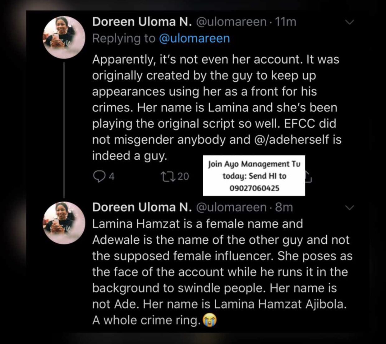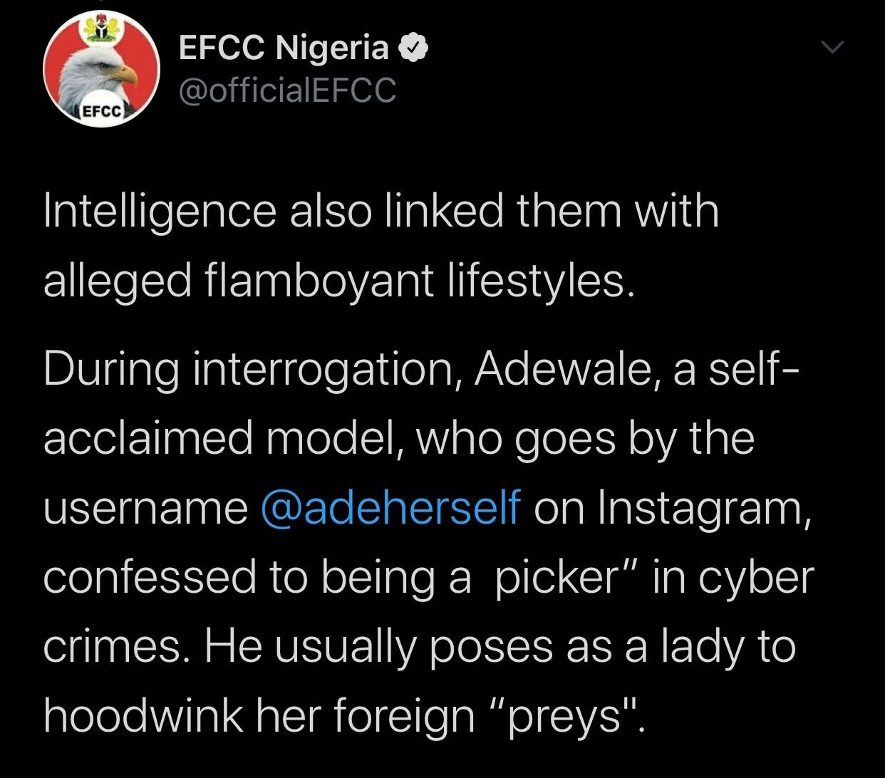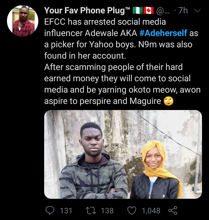 The Economic and financial crimes commission (EFCC), a day and some hours ago arrested a popular Twitter and Instagram influencer and self-acclaimed Model known as "adeherself" with real name-- Lamina Hamzat Ajibola. She was arrested with a guy identified as Adedamola Adewale, allegedly the brain behind the lady's social media personality, and 3 other alleged internet fraudsters.