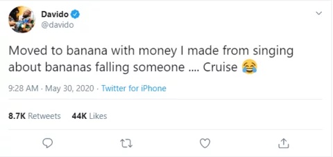 He wrote, "Moved to banana with money I made from singing about bananas falling someone .... Cruise 😂"