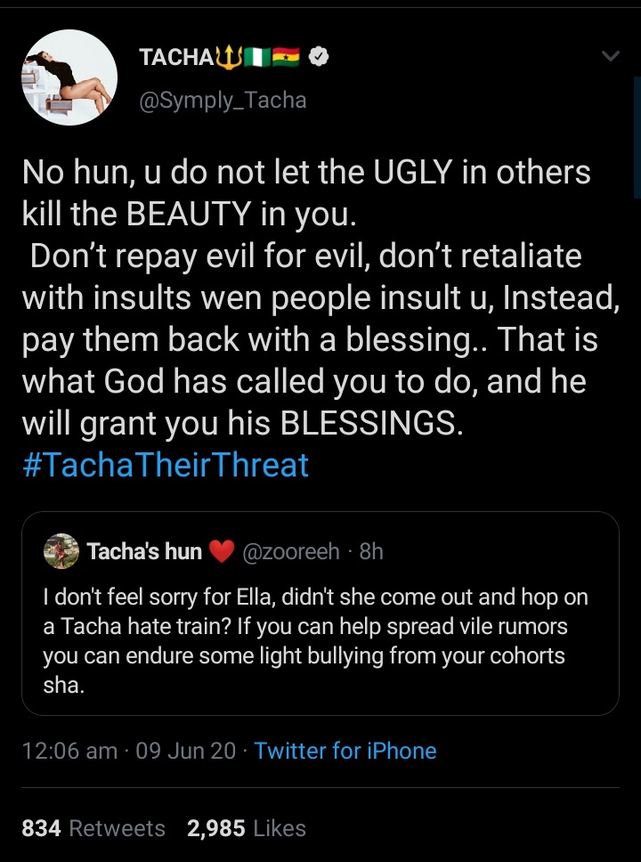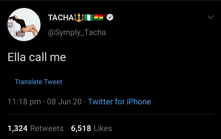 Of course Tacha wasn't going to let this opportunity go, she was on twitter trolling non stop, and even called their WhatsApp group stupid and tweeted "Ella Call me"... Mimicking Davido's viral "Cynthia Morgan call me" tweet.