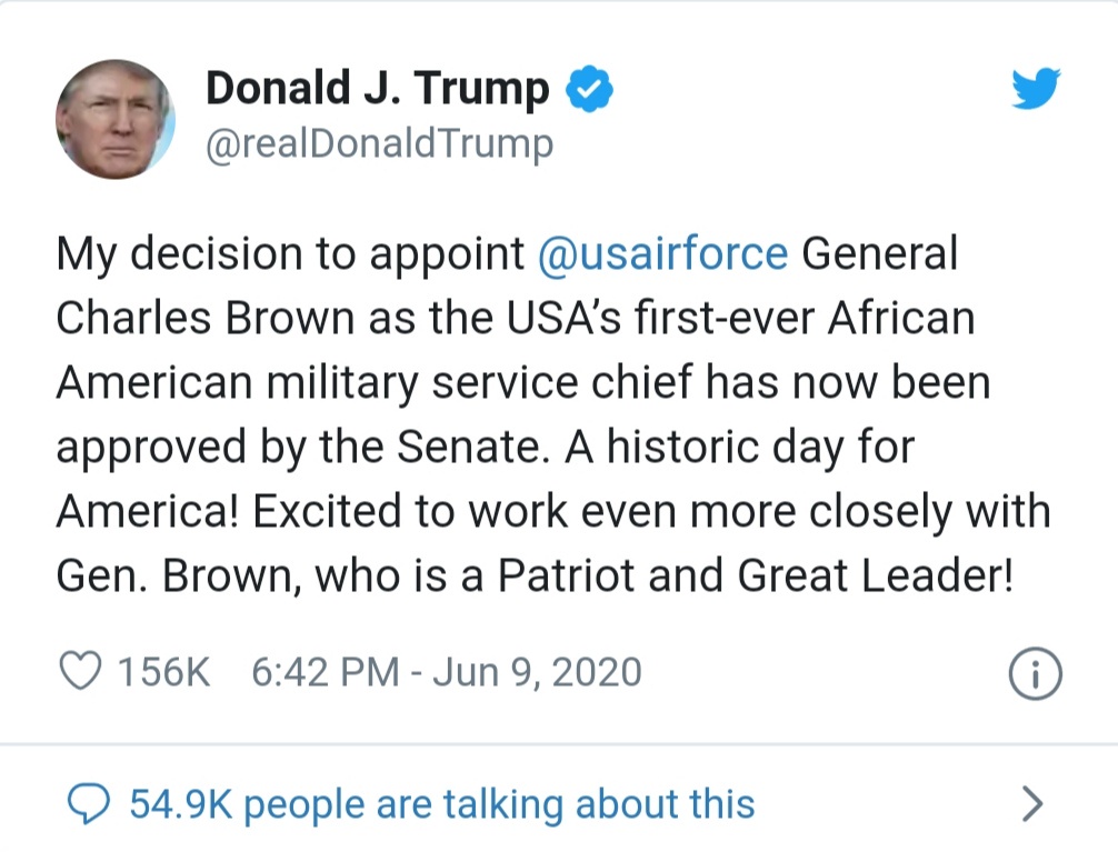 The death of George Floyd has come as a big slap on President Trump's administration, but this confirmation of a black man as the chief of staff of Air Force is really a smart move. And it will hopefully earn him the forgiveness of the black people in America.