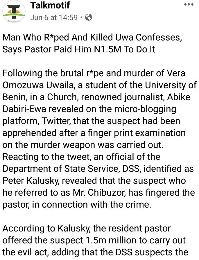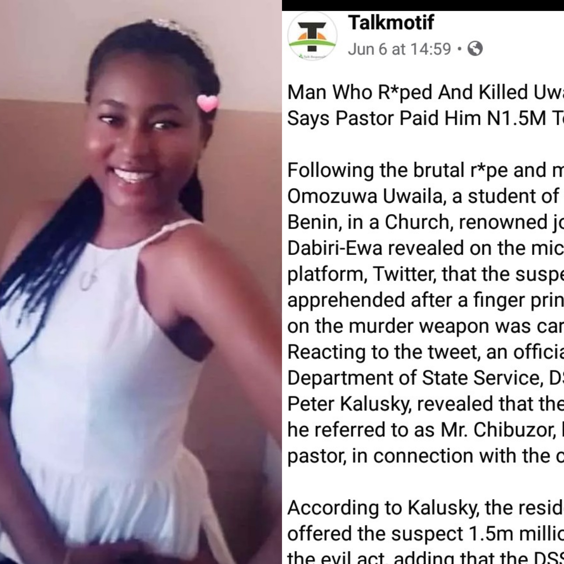 Just early this week, I started seeing updates from some people that one of the suspects who killed Uwa has been caught. That he also has confessed that, it was the church Pastor who paid them #1.5million to murder the innocent girl. The added that Uwa was pregnant for the married Pastor, who demanded an abortion to no avail. In a bid to cover up his track, the pastor set her up in the church where she was killed.