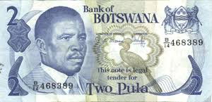 5. Botswanan Pula (1 USD = 11.70 BWP): the pula is the currency of Botswana. Pula literally means " rain" in Setswana, because rain is very scarce in Botswana - home to much of the Kalahari desert - and therefore valuable and a blessing. Botswana's economy is mostly dependent on diamond mining. Diamond mining contributes to 50% of the government revenue.