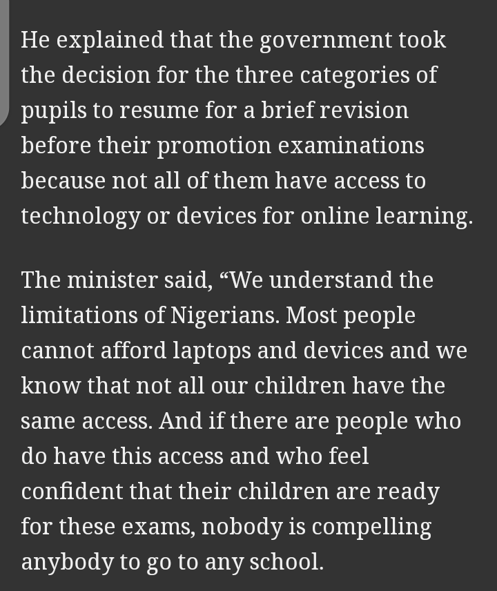 However, the federal government through the Minister for State of Education, Chukwuemeka Nwajiuba, had disclosed on Wednesday via an interview on Channels, that the reopening of schools nationwide is only for the graduating students, specifically Students in primary 5 or 6, JSS 3 and SSS 3.