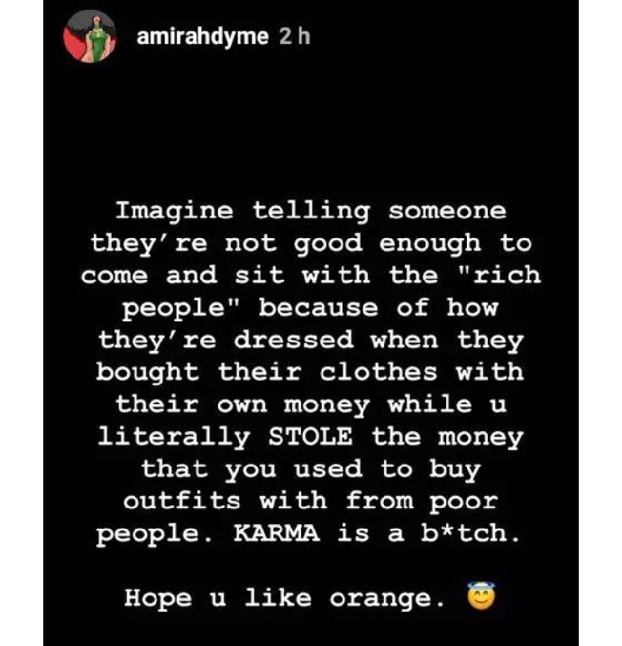 She wrote "Imagine telling someone they're not good enough to come and sit with the rich people because of how they're dressed while they brought their clothes with their own money while u literally stole the money you used to buy your outfit with from the poor people. KARMA is a b*tch." Hope you like orange? See screenshot