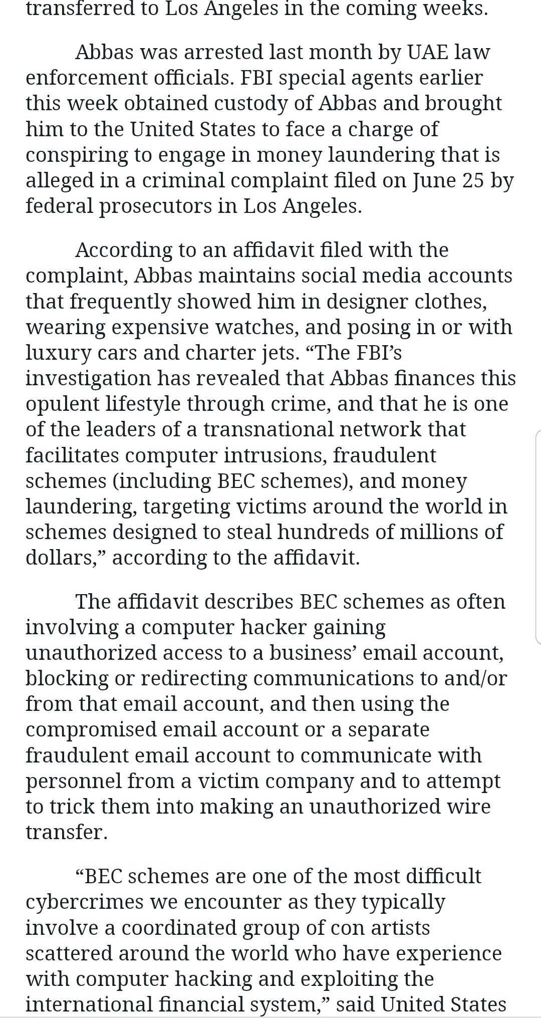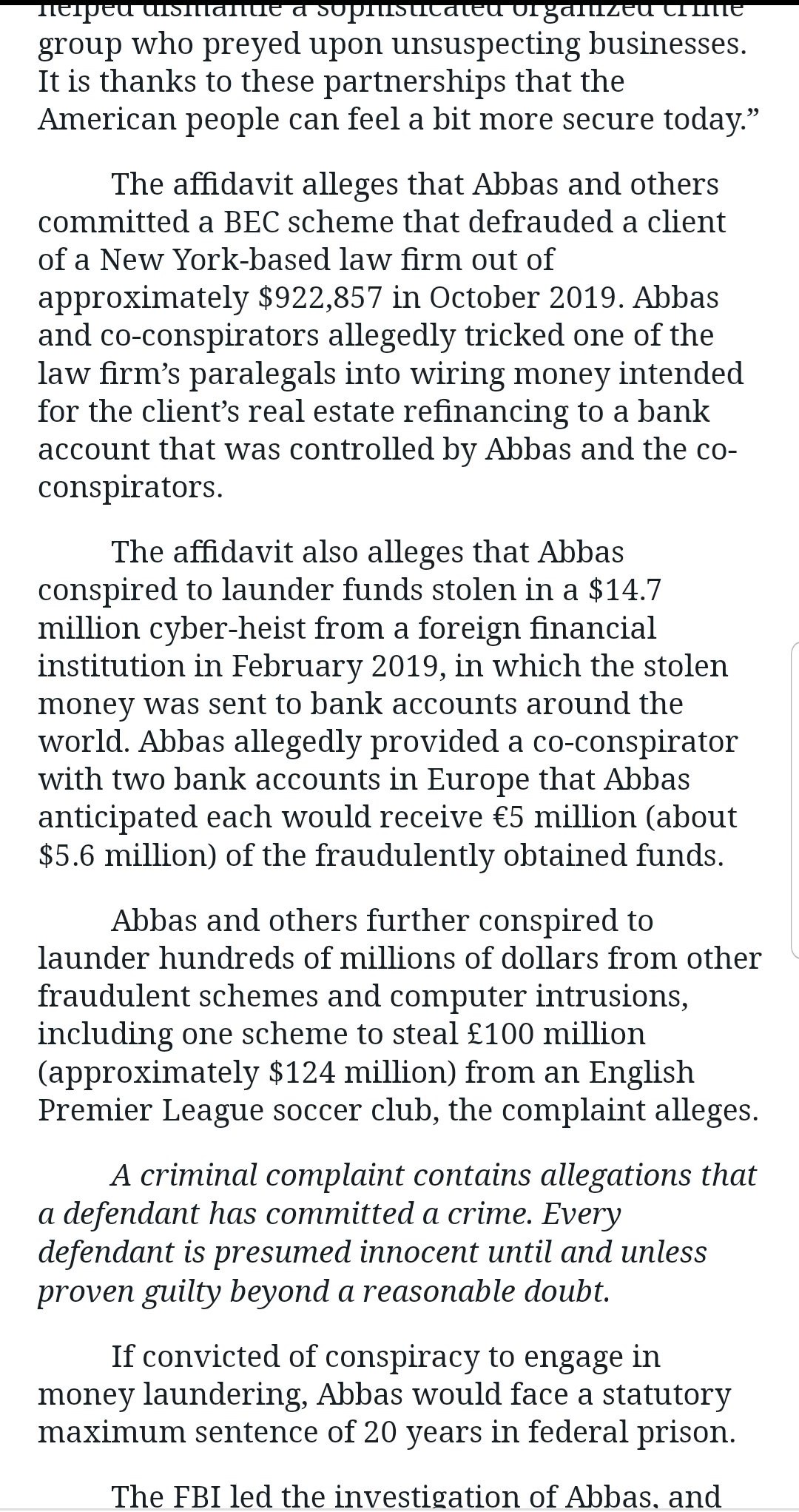 Abbas and others further conspired to launder hundreds of millions of dollars from other fraudulent schemes and computer intrusions, including one scheme to steal £100 million (approximately $124 million) from an English Premier League soccer club, the complaint alleges,”