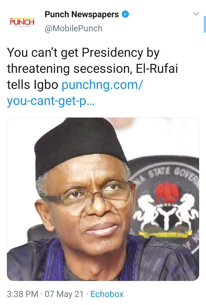 Kaduna State Governor, Nasir el-Rufai, says although he believes the South should produce the next President, the people of the South-East must note that they cannot get the Presidential seat by threatening others with secession.