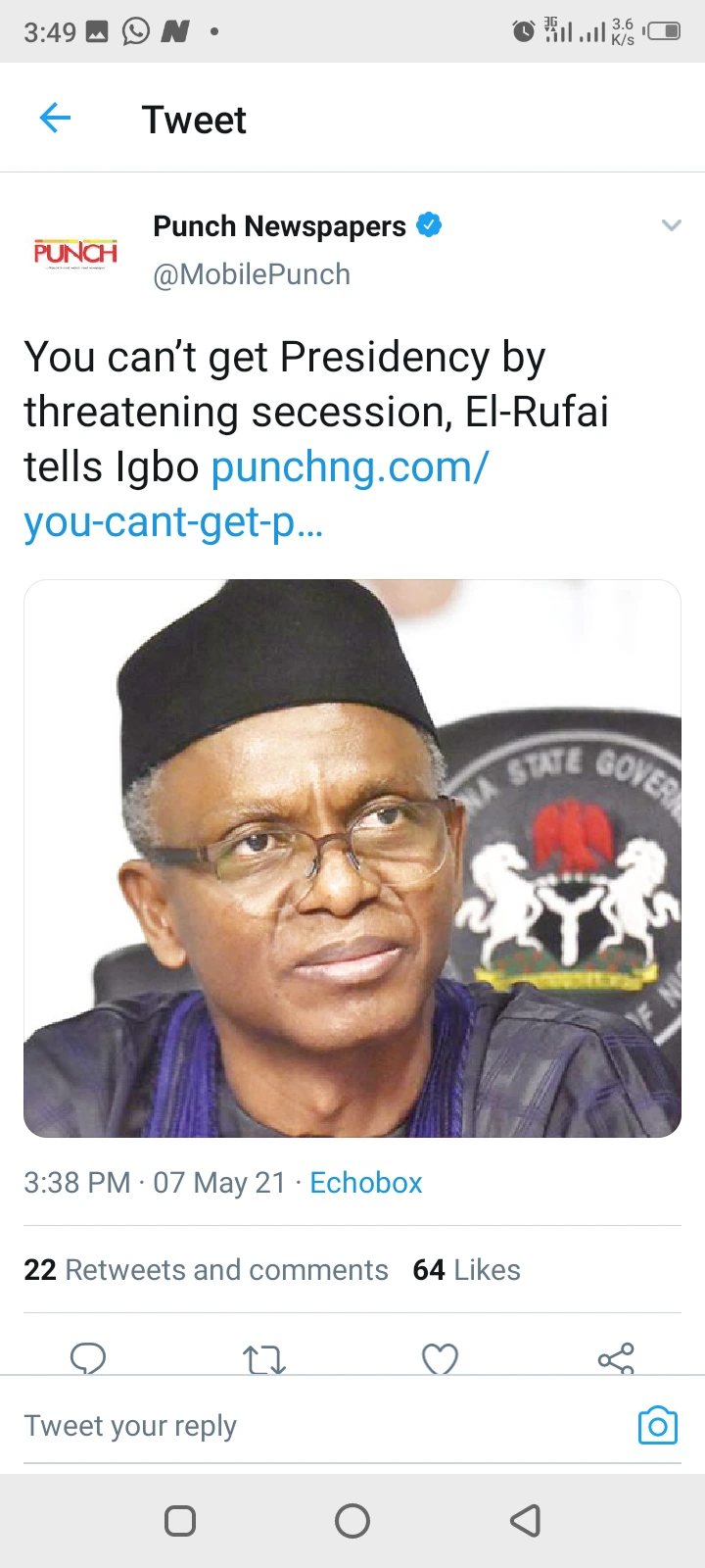 Kaduna State Governor, El-Rufai has felt the need to send an important message to the people of the South East. El-Rufai believes the Igbo people are yearning for an independent region because they want the presidency in 2023.
